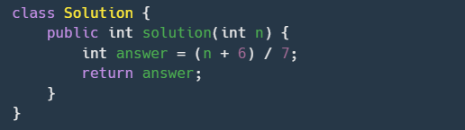 모든 사람이 피자를 한 조각 이상 먹기 위해 필요한 피자의 수를 구하기 위해 (n + 6) / 7 식을 이용해줍니다.