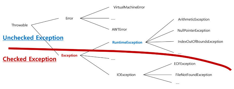 반드시 예외 처리해야 하는 Checked Exception과 해주지 않아도 되는 Unchecked Exception으로 나뉨