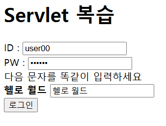 | 아이디 : user00 비밀번호 : pass00 check : 헬로 월드 모두 일치하는 경우 -> "로그인 성공" 불일치한 내용이 있을 경우 -> 000이 일치하지 않습니다 (000은 ID, PW, CHECK) |