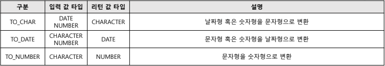 | 그룹 함수 | N개의 행의 컬럼 값을 전달하여 1개의 결과가 반환 (그룹의 수가 늘어나면 그룹의 수 만큼 결과를 반환) |