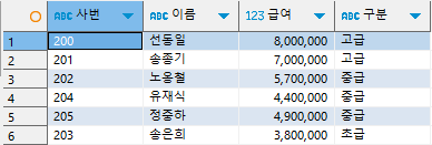 - 구분은 받는 급여에 따라 초급, 중급, 고급으로 조회
